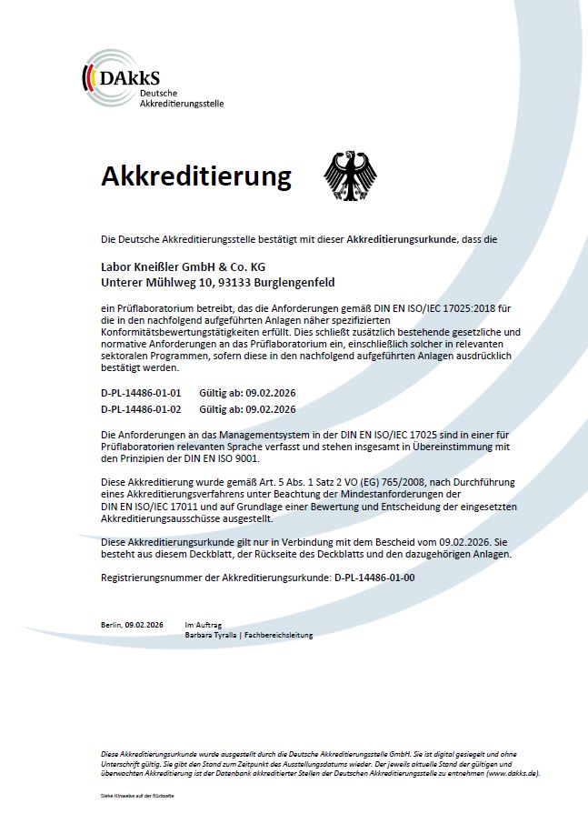 Höchste Ansprüche. Grundlage unserer Analytik nach DIN EN ISO 17025:2018 bilden nationale und internationale Normvorgaben. Sorgfältige Validierung, laufende Qualitätssicherungsmaßnahmen sowie regelmäßige Teilnahme an Eignungsprüfungen (Ergebnisse auf Anfrage erhältlich) sichern Richtigkeit und Reproduzierbarkeit unserer Ergebnisse. Gutachter der deutschen Akkreditierungsstelle DAkkS überwachen regelmäßig die Einhaltung der Anforderungen der DIN EN ISO 17025:2018.